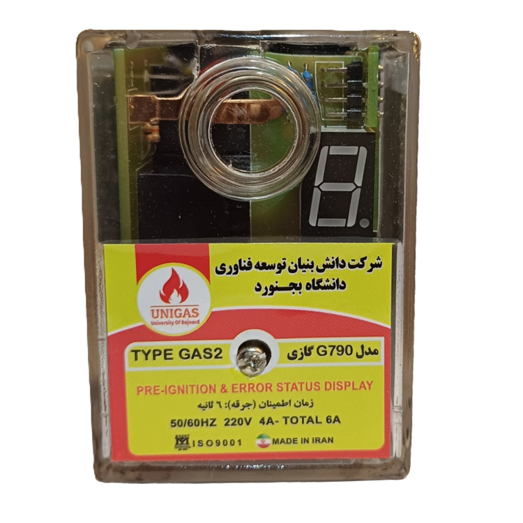 رله کنترلر مشعل گازی G790 مدل GAS2 محصولی از شرکت دانشبنیان با برند یونیگاز است که با تکیه بر فناوری روز و دانش فنی داخلی طراحی و تولید شده است. این رله بهراحتی روی پایههای 9پین استاندارد مشعلهای گازسوز فندار نصب میشود و نقش مهمی در کنترل ایمن فرایند احتراق ایفا میکند. کنترل شعله در این دستگاه با استفاده از میله یونیزاسیون انجام میشود و بدنهی آن از پلیکربنات نسوز و نشکن ساخته شده که مقاومت بالایی در برابر حرارت و ضربه دارد. از جمله ویژگیهای شاخص این کنترلر، میتوان به قابلیت پشتیبانی از دو شیر برقی سوخت اشاره کرد. همچنین دستگاه به نمایشگر LED وضعیت شعله و خطای مشعل مجهز است تا فرآیند نظارت و عیبیابی بهراحتی انجام شود. از دیگر امکانات مهم این کنترلر میتوان به موارد زیر اشاره کرد: سیستم اطمینان از دبی مناسب هوای دمندهی فن برای عملکرد صحیح مشعل. نمایشگر دیجیتال جهت نمایش کد خطاها و مراحل راهاندازی مشعل سیستم تلاش مجدد در صورت خطای شعله (Flame Failure Retry) جهت افزایش ایمنی سیستم مکانیزم کنترل صحت عملکرد پرشر هوا برای پیشگیری از خطرات ناشی از اختلال تامین هوای ورودی به مشعل (لطفا توجه شود که در صورت انجام اتصال کوتاه پرشر هوا (اتصال کوتاه پایه 5 و 7)، نمایشگر رله خطای شماره 1 را نشان میدهد و برای رفع مشکل بایستی پرشرسوئیچ روی مشعل نصب باشد.) خروجی دوم برای شیر برقی همراه با کنترل عملکرد آن پس از پایداری شعله خروجی آلارم با رله مستقل داخلی برای هشدارهای ایمنی مکانیزم پیشجرقه (Pre-Ignition) با رله مستقل داخلی برای شروع مطمئن احتراق این محصول با گارانتی 24 ماهه از زمان تولید، عرضه میشود و انتخابی مطمئن برای ارتقای ایمنی و بهرهوری در سیستمهای مشعل گازی به شمار میرود.