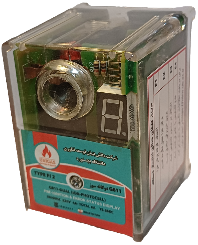 رله کنترلر مشعل G811 دوگانه سوز فتوسل یون نمایشگردار مدل FI 2 ، محصول شرکت دانشبنیان با برند یونیگاز است که با استفاده از سنسور فتوسل برای تشخیص شعله در حالت گازوئیل و میله یون برای حالت گاز، کنترل ایمن و بهینهٔ احتراق را در مشعلهای دوگانهسوز را تضمین میکند. این رله بهطور هوشمند تشخیص میدهد که مشعل در کدام حالت (گاز یا گازوئیل) فعال است. این کنترلر در بدنهای مقاوم از پلیکربنات نسوز و نشکن قرار گرفته و بهسادگی روی پایههای 9پین استاندارد نصب میشود. نمایشگر سونسگمنت تک رقمی و LED مجزا، وضعیت شعله و کدهای خطا را بهصورت دیجیتال نمایش میدهند و قابلیت پشتیبانی از دو شیر برقی، خروجی آلارم و مکانیزم پیشجرقه نیز از ویژگیهای کلیدی آن است. این محصول با گارانتی 24 ماهه از زمان تولید ارائه میشود و خدمات پس از فروش شرکت یونیگاز، شامل تعمیر و تأمین قطعات یدکی را پوشش میدهد.