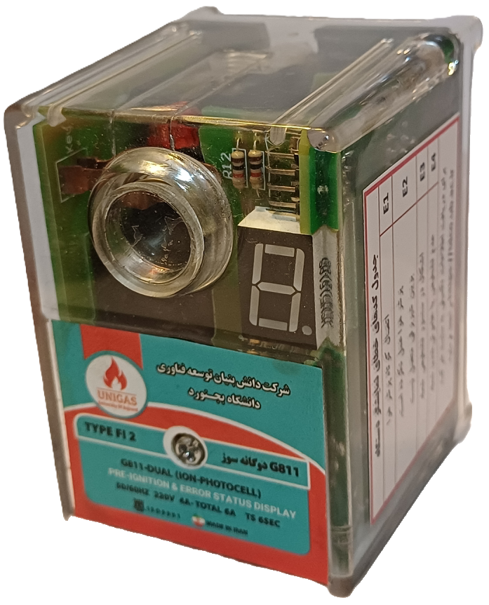 رله کنترلر مشعل G811 دوگانه سوز فتوسل یون نمایشگردار مدل FI 2 ، محصول شرکت دانشبنیان با برند یونیگاز است که با استفاده از سنسور فتوسل برای تشخیص شعله در حالت گازوئیل و میله یون برای حالت گاز، کنترل ایمن و بهینهٔ احتراق را در مشعلهای دوگانهسوز را تضمین میکند. این رله بهطور هوشمند تشخیص میدهد که مشعل در کدام حالت (گاز یا گازوئیل) فعال است. این کنترلر در بدنهای مقاوم از پلیکربنات نسوز و نشکن قرار گرفته و بهسادگی روی پایههای 9پین استاندارد نصب میشود. نمایشگر سونسگمنت تک رقمی و LED مجزا، وضعیت شعله و کدهای خطا را بهصورت دیجیتال نمایش میدهند و قابلیت پشتیبانی از دو شیر برقی، خروجی آلارم و مکانیزم پیشجرقه نیز از ویژگیهای کلیدی آن است. این محصول با گارانتی 24 ماهه از زمان تولید ارائه میشود و خدمات پس از فروش شرکت یونیگاز، شامل تعمیر و تأمین قطعات یدکی را پوشش میدهد.